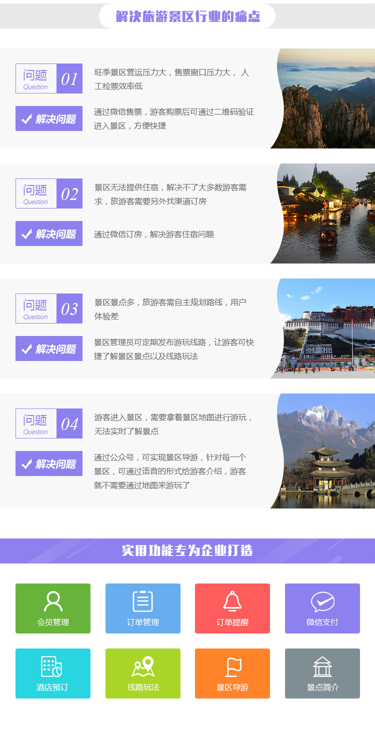 會員管理 訂單管理 訂單提醒 微信支付 酒店預越 線路玩法 景區(qū)導游 景點介紹