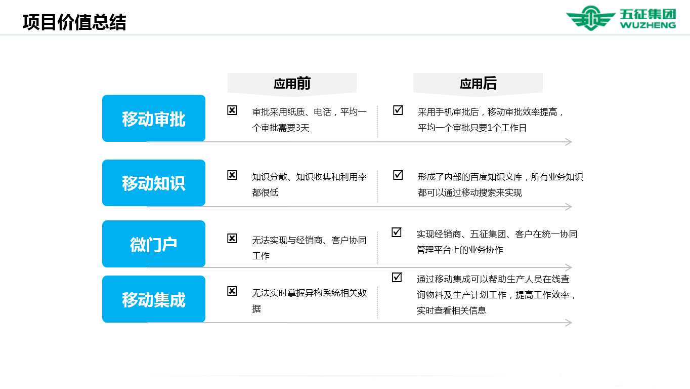 項(xiàng)目價值: 1、五征集團(tuán)OA項(xiàng)目實(shí)施上線后,使用總?cè)藬?shù)超過10000,平均每日PC端在線人數(shù)超過800,每天產(chǎn)生500條以上的流程,總計(jì)約提升工作效率300%以上,大大改善了集團(tuán)內(nèi)部的工作,實(shí)現(xiàn)公司高效協(xié)同辦公。 2、OA協(xié)同辦公平臺搭建了移動微門戶,打通企業(yè)內(nèi)外網(wǎng),滿足客戶“隨時”購車需求。移動微門戶實(shí)現(xiàn)統(tǒng)一入口,統(tǒng)一信息發(fā)布,產(chǎn)品展示,在線訂單管理,經(jīng)銷商管理以及微信、微博管理。 3、通過OA與DMS系統(tǒng)集成,實(shí)現(xiàn)業(yè)務(wù)人員移動化的客戶管理;系統(tǒng)建立任務(wù)監(jiān)督與日常執(zhí)行的應(yīng)用閉環(huán),實(shí)現(xiàn)任務(wù)與日程管理; 4、項(xiàng)目實(shí)現(xiàn)了多層級分權(quán)的門戶管理,建立了個人門戶、集團(tuán)門戶、各大職能門戶以及專題門戶;