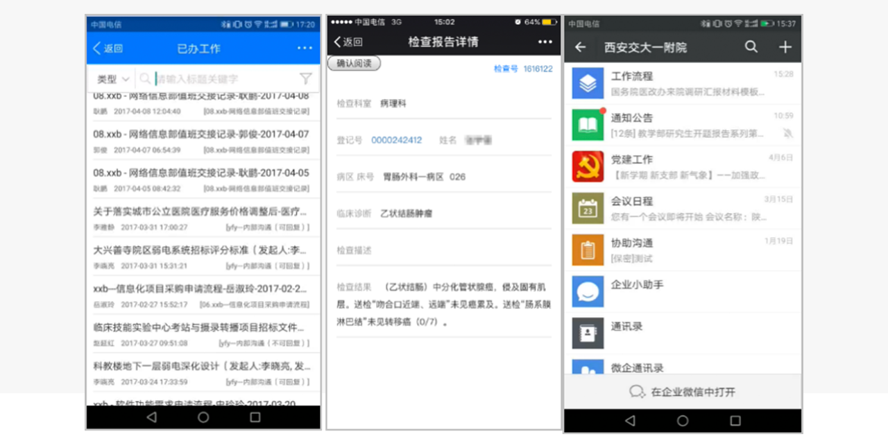 ▊公司介紹: 西安交通大學(xué)第一附屬醫(yī)院于1956年建院,是國(guó)家衛(wèi)生計(jì)生委委管大型綜合性三級(jí)甲等醫(yī)院,是全國(guó)首批暨陜西省首家“三級(jí)甲等醫(yī)院”、全國(guó)首批“百佳醫(yī)院”, 目前在職職工4400余人,開放床位2560張;2016年服務(wù)門急診患者241萬(wàn)、住院患者11.8萬(wàn) 按照“兩院四區(qū)”的戰(zhàn)略布局,目前已經(jīng)全面托管了陜西省彬縣中醫(yī)醫(yī)院、韓城民楊醫(yī)院等基層醫(yī)院,并全力推進(jìn)國(guó)際陸港醫(yī)院、興善寺分院、延安新區(qū)醫(yī)院等合作項(xiàng)目。 ▊項(xiàng)目需求: 1、將HIS系統(tǒng)等業(yè)務(wù)數(shù)據(jù)集成到 宇淼 OA頁(yè)面中集中展現(xiàn),如醫(yī)院門診、護(hù)理等業(yè)務(wù)信息,方便院內(nèi)領(lǐng)導(dǎo)、職工實(shí)時(shí)查看; 2、管理信息化,醫(yī)院行政辦公流程電子化、信息化,利用軟件系統(tǒng)輔助醫(yī)院日常管理,減輕醫(yī)院職工處理日常事物工作強(qiáng)度; 3、滿足醫(yī)院移動(dòng)化辦公的需求,提高業(yè)務(wù)、辦公事務(wù)處理效率 ▊項(xiàng)目建設(shè)內(nèi)容: 1、將醫(yī)院HIS系統(tǒng)數(shù)據(jù)集成到OA中,并形成報(bào)表門戶頁(yè)面,同時(shí)支持在PC端、移動(dòng)端訪問,便于院內(nèi)領(lǐng)導(dǎo)、職工時(shí)刻掌握醫(yī)院各項(xiàng)院務(wù)信息;實(shí)現(xiàn)單點(diǎn)登錄,便捷日常使用。 2、流程管理應(yīng)用:完成了醫(yī)院內(nèi)從行政辦公到醫(yī)院日常業(yè)務(wù),所有板塊合計(jì)200多條流程的電子化,包含門診、護(hù)理、采購(gòu)乃至醫(yī)風(fēng)醫(yī)德建設(shè)等所有流程,還可通過可視化流程圖對(duì)流程進(jìn)度進(jìn)行追蹤,只需通過后端引擎配置實(shí)現(xiàn),不需要開發(fā)。同時(shí)也支持集團(tuán)化分級(jí)分權(quán)管理和移動(dòng)端應(yīng)用。 3、提供移動(dòng)端App 和微信應(yīng)用,通過手機(jī)即可完成: ①醫(yī)生查房:查看患者各項(xiàng)信息、危急值,隨時(shí)隨地掌控患者的病情,及時(shí)根據(jù)患者病情對(duì)患者治療方案進(jìn)行調(diào)整; ②流程查看、處理 選擇 工作流程--選中流程--辦理流程--選擇人員轉(zhuǎn)發(fā)--提交完成 ③醫(yī)院公文、通知公告提醒;組織成員即時(shí)通訊、群組會(huì)話等 ▊項(xiàng)目?jī)r(jià)值: 1、醫(yī)院HIS系統(tǒng)數(shù)據(jù)集成,發(fā)布到報(bào)表門戶頁(yè)面集中展現(xiàn),并支持PC端和移動(dòng)端同步查看,方便院領(lǐng)導(dǎo)、職工時(shí)刻掌握醫(yī)院的業(yè)務(wù)運(yùn)營(yíng)狀態(tài); 2、實(shí)現(xiàn)了院內(nèi)流程的全面電子化,涵蓋醫(yī)院所有業(yè)務(wù)板塊、合計(jì)200多條流程。系統(tǒng)部署半年后,流程流轉(zhuǎn)總數(shù):9萬(wàn)余條,其中已辦率98.29%。提高辦事效率的同時(shí),也促進(jìn)了醫(yī)院各部的規(guī)范化管理; 3、移動(dòng)端App、微信應(yīng)用,全院全業(yè)務(wù)支持移動(dòng)化管理,隨時(shí)隨地處理醫(yī)院事務(wù),大大提升全院溝通效率;平臺(tái)賬號(hào)5335個(gè),總登錄人次70萬(wàn)余人次,移動(dòng)辦公登錄超過四分之一; 4、為醫(yī)院構(gòu)建的統(tǒng)一知識(shí)管理平臺(tái),半年內(nèi): · 文檔創(chuàng)建總數(shù):92000多條 · 文檔下載次數(shù):27萬(wàn)余條 · 完成網(wǎng)上調(diào)查:7百余條